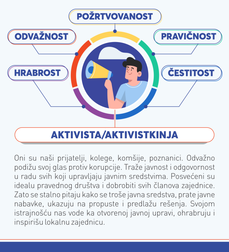 - svojim građanskim angažovanjem doprineli razumevanju problema, prevenciji i borbi protiv korupcije;